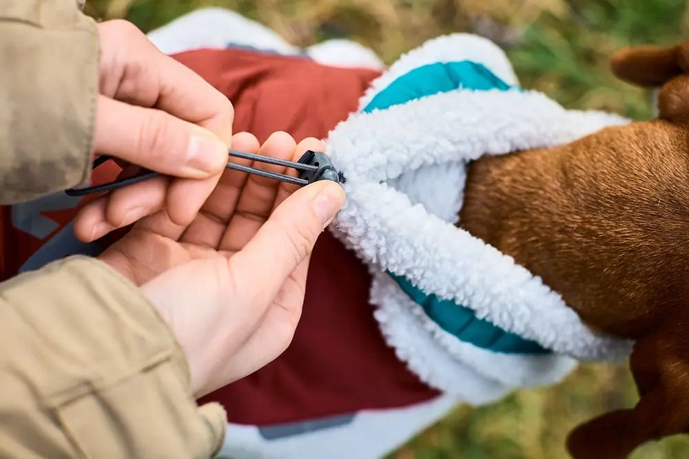 Die Jacke ist für eine optimale Passform verstellbar. Beinschlaufen sorgen dafür, dass die Jacke an Ort und Stelle bleibt, egal ob Dein Hund liegt oder sich bewegt. Die Jacke ist so geformt, dass sie die großen Muskelgruppen Deines Hundes gut abdeckt und gleichzeitig für Komfort und uneingeschränkte Bewegungsfreiheit sorgt.