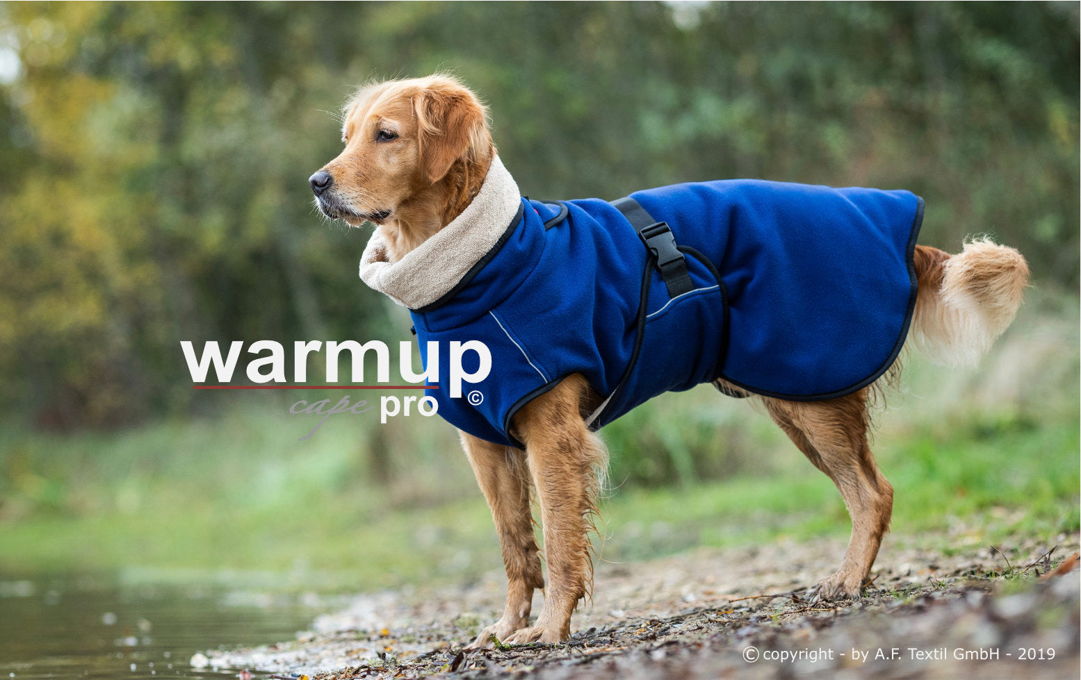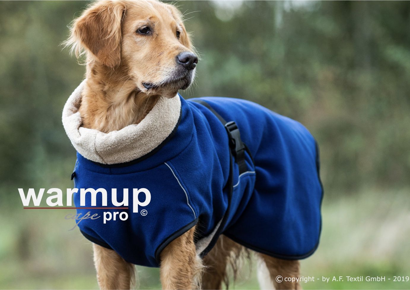 Das „Warmup Cape Pro“ hat einen angeschnittenen Bauchlatz und einem wärmenden Kragen, der auch die empfindliche Halspartie umschliesst und wärmt. Darin sind die Hunde nach der Jagd, dem Training, dem Seminar oder der Prüfung gut eingepackt, wenn diese nass oder erhitzt im kalten Auto oder auf kühlem Untergrund liegen und warten müssen. So minimiert sich die Gefahr des Auskühlens und der Erkrankung!
