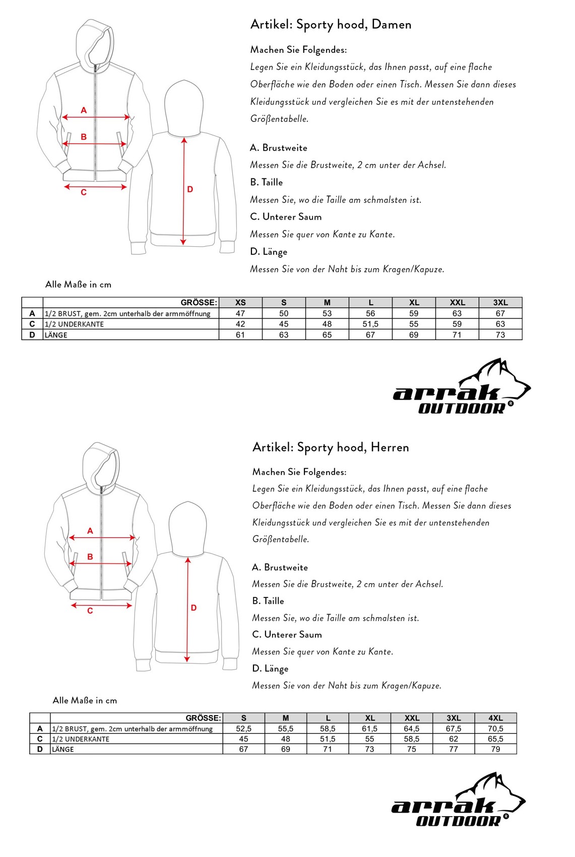 Ein superangenehmer Qualitätshoodie aus robustem Sweatmaterial, 80 % Baumwolle und 20 % Polyester. Der Stoff hat eine weiche gebürstete Innenseite. Brusttasche mit Reißverschluss sowie 2 Reißverschlusstaschen für die Hände. Am Rückenende ist außerdem eine praktische Rückentasche angebracht. Verstellbare Kapuze. Arrak-Logo auf Brust und Kapuze. Das Damenmodell ist leicht tailliert, Herren Normal-Schnitt