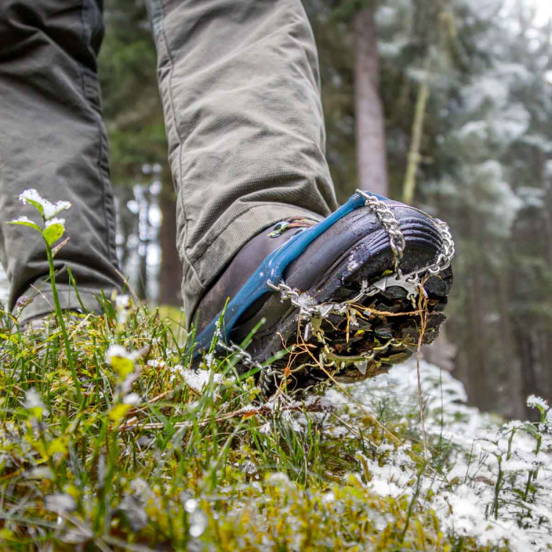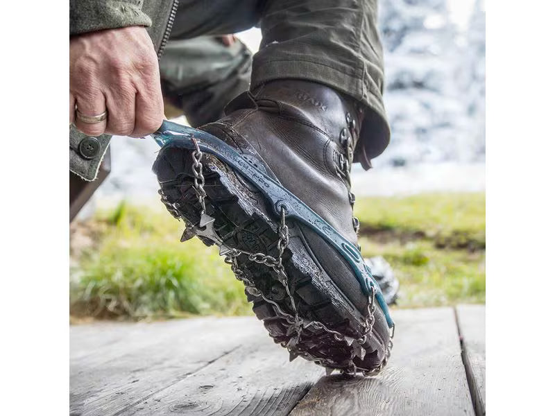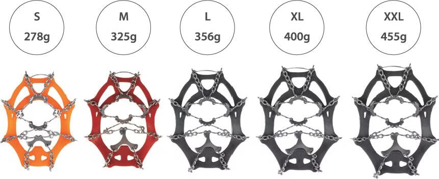 Snowline geben sicheren Halt beim Gehen und Laufen auf Schnee sowie auf eisigem oder rutschigem Untergrund. Flexibler Elastomergummi bietet festen Sitz, passend für unterschiedlichste Schuhe, vom leichten Wanderschuh bis zum isolierten Winterstiefel, genauso wie für Skitouren- und Trailrunningschuhe. Grössen Wanderschuhe: S = 32/36 (orange, 270g), M = 36/40 (rot, 320g), L = 40/44 (blau, 360g), XL = 44/48 (grau, 410g), XXL = 48/52 (schwarz, 430g)