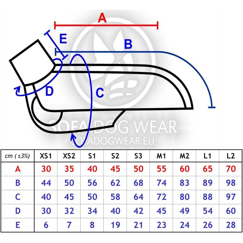 A (Red) =Back length of the dog (note measured from the shoulder blade bone directly above the base of the front leg and tail)