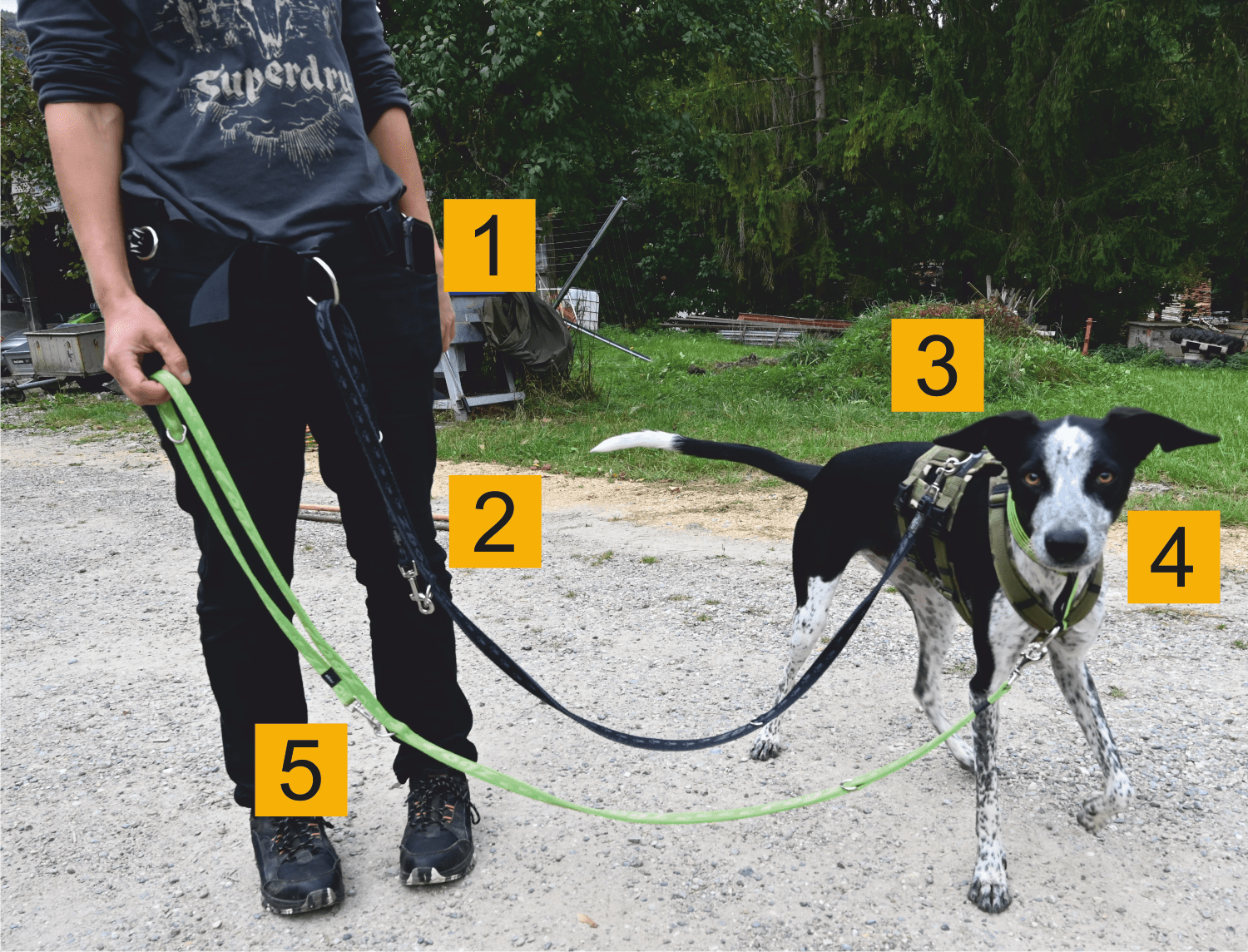 5. Lead from the dog owner to the collar -> This leash serves as a second security in case a carabiner opens on the first leash or a material defect occurs. (We recommend webbing lines here, not biothane lines -> High-quality carabiners and length-adjustable ones are, for example, our Rogz lines)