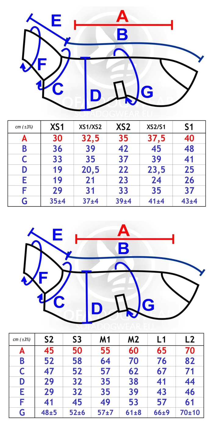 A (Red) =Back length of the dog (note measured from the shoulder blade bone directly above the base of the front leg and tail)