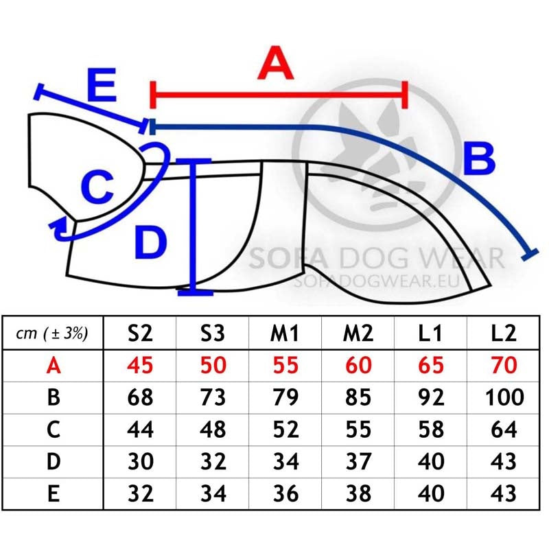 • A (Red) =Back length of the dog (note measured from the shoulder blade bone directly above the base of the front leg and tail)