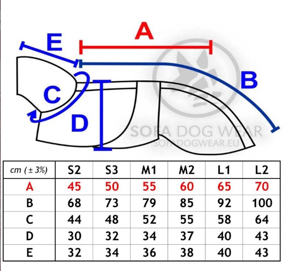 • A (Red) =Back length of the dog (note measured from the shoulder blade bone directly above the base of the front leg and tail)