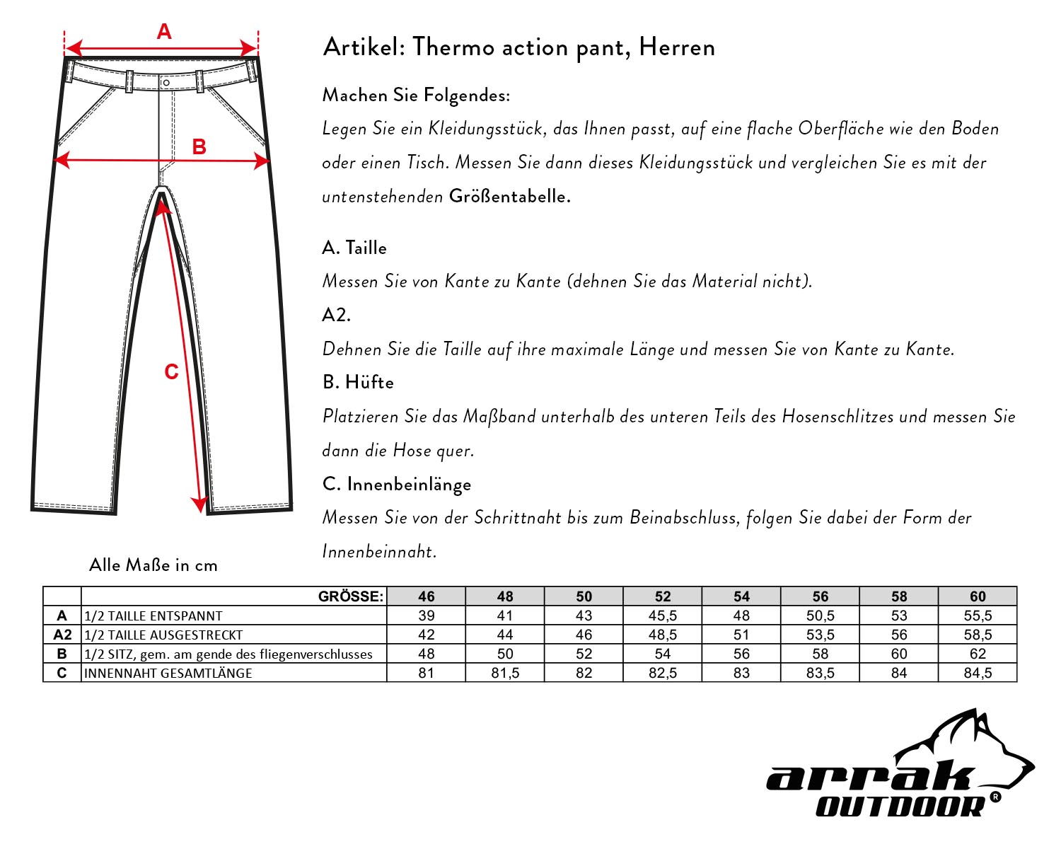 The Thermo Action from Arrak is a very comfortable and warmly lined softshell pant. The outer material is made of 88% nylon and 12% spandex, which makes the pants extremely adaptable. With a 3000 mm water column, the pants are also water-repellent. The inside is lined with warm and soft microfleece. Elastic waistband for an optimal fit. Seven belt loops. The thigh sections have ventilation zips with mesh material on the inside. The pants have two large leg pockets and two hand pockets with zips. The leg openings are adjustable using press studs.