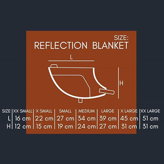 La couverture Reflection couvre la poitrine, les épaules et une grande partie du dos du chien. C'est facile à mettre et à enlever. Les sangles élastiques à l'avant et sous la poitrine sont réglables pour s'adapter parfaitement au chien.