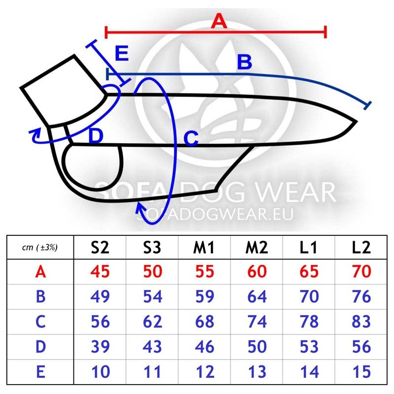 B, C, D, E (Bleu) = Mesures à partir de la chemise, pas à partir du chien !