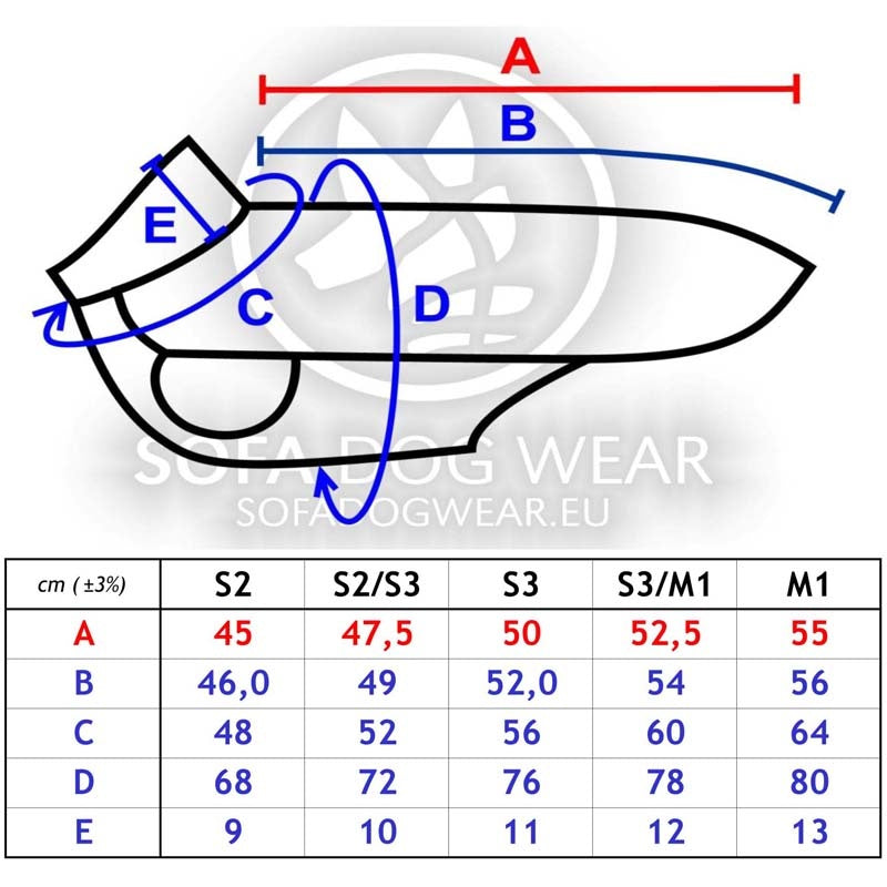• B, C, D,... (Bleu) =Mesure de la chemise (PAS du chien !)