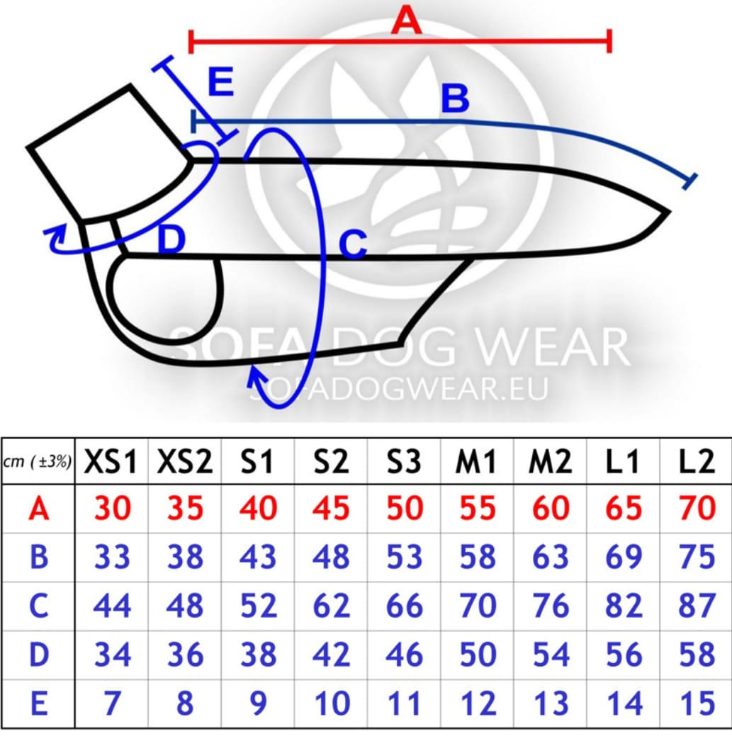 • A (Rouge) =Longueur du dos du chien (note mesurée à partir de l'os de l'omoplate directement au-dessus de la base de la patte avant et de la queue)