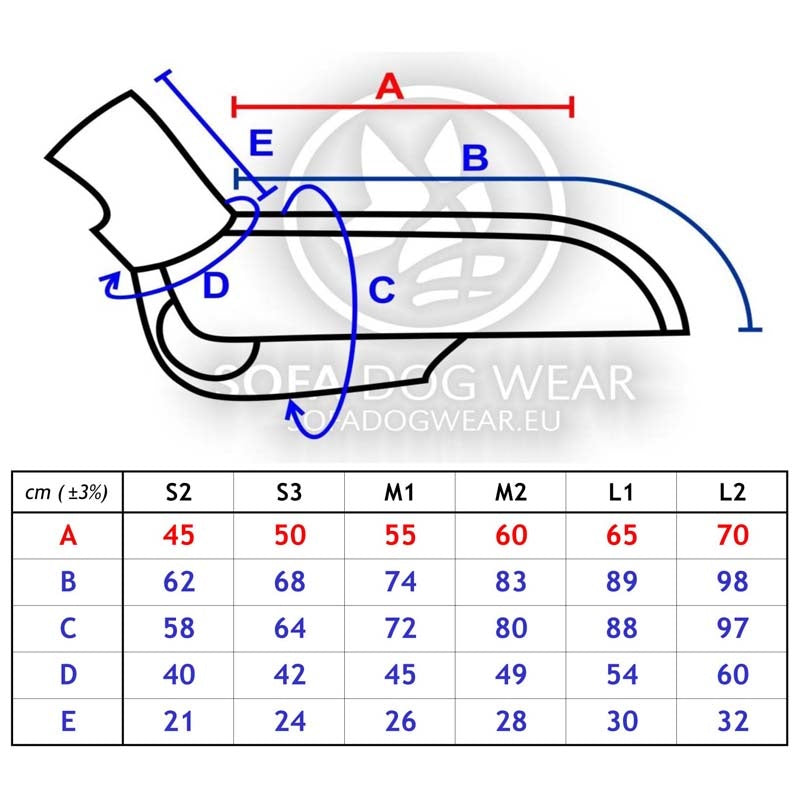 B, C, D,... (Bleu) =Mesure de la chemise (PAS du chien !)