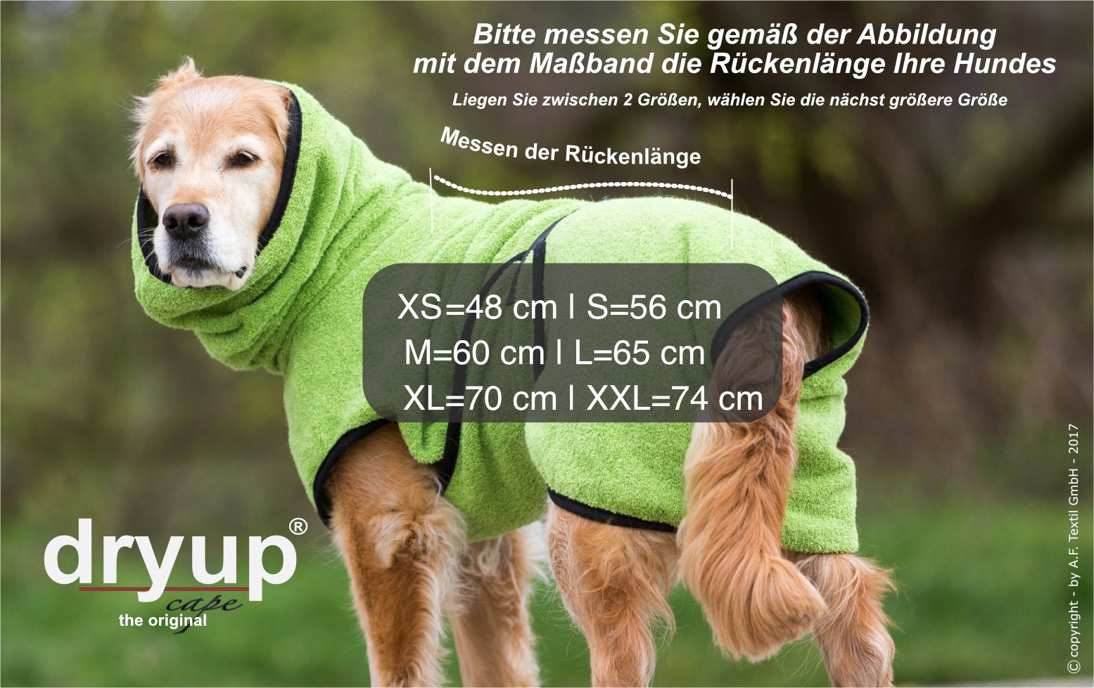 Das Dryup cape ist aus 100% Baumwoll-Frottee gefertigt und garantiert somit keine statische Aufladung. Durch die typisch großen Schlingen wird die Oberfläche des Stoffes enorm vergrößert. Damit hat das Gewebe so wesentlich mehr Volumen als alle anderen Gewebearten! Außerdem speichert die "Naturfaser" Baumwolle die Feuchtigkeit direkt in ihren Fasern und transportiert so die Nässe vom Hundefell weg.